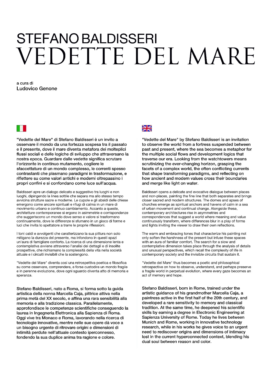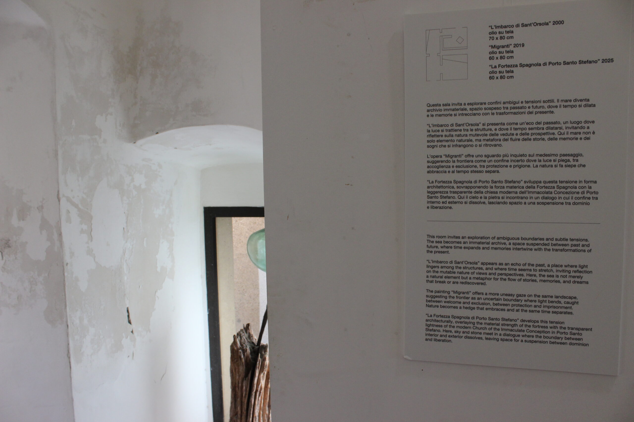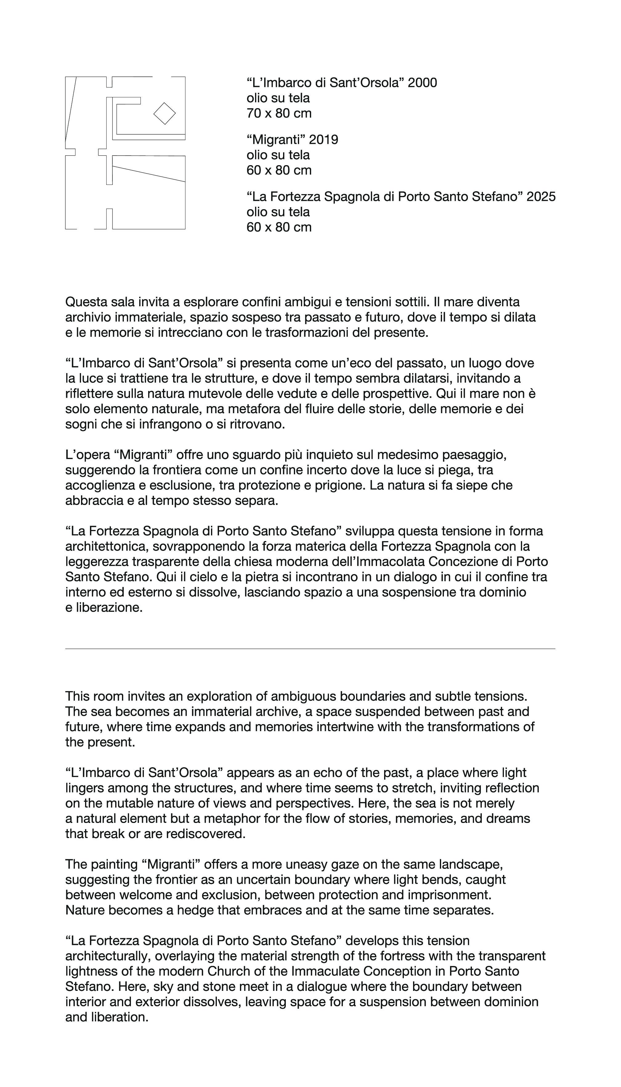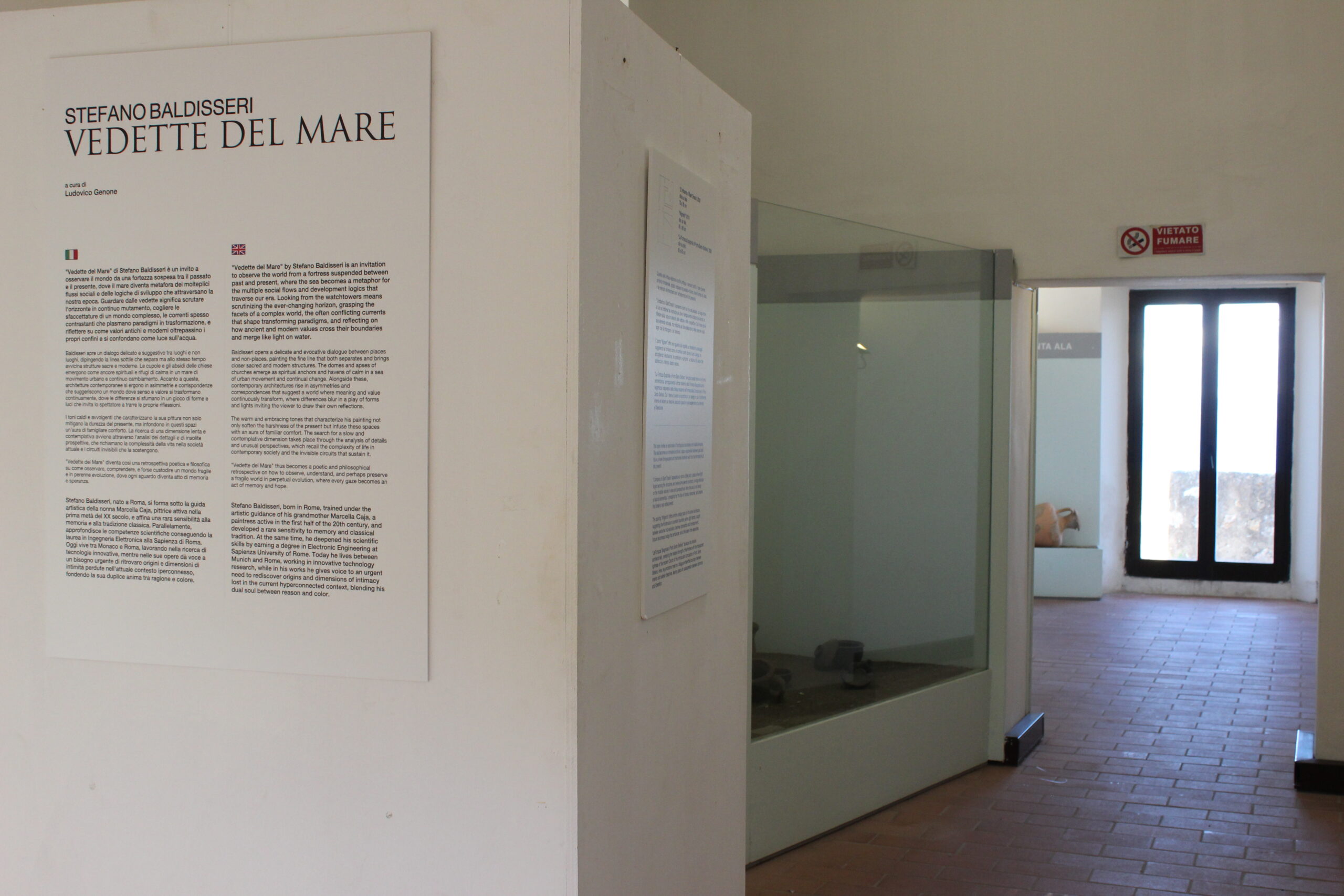 “Vedette del mare” is an invitation to observe the world from a fortress suspended between past and present, where the sea becomes a metaphor for multiple social flows and developing logics that traverse our era. To look from the watch towers means scrutinizing the ever-changing horizon, grasping the facets of a complex world, the often-conflicting currents that shape transforming paradigms, and reflecting on how ancient and modern values transcend their boundaries and blend like light on water.